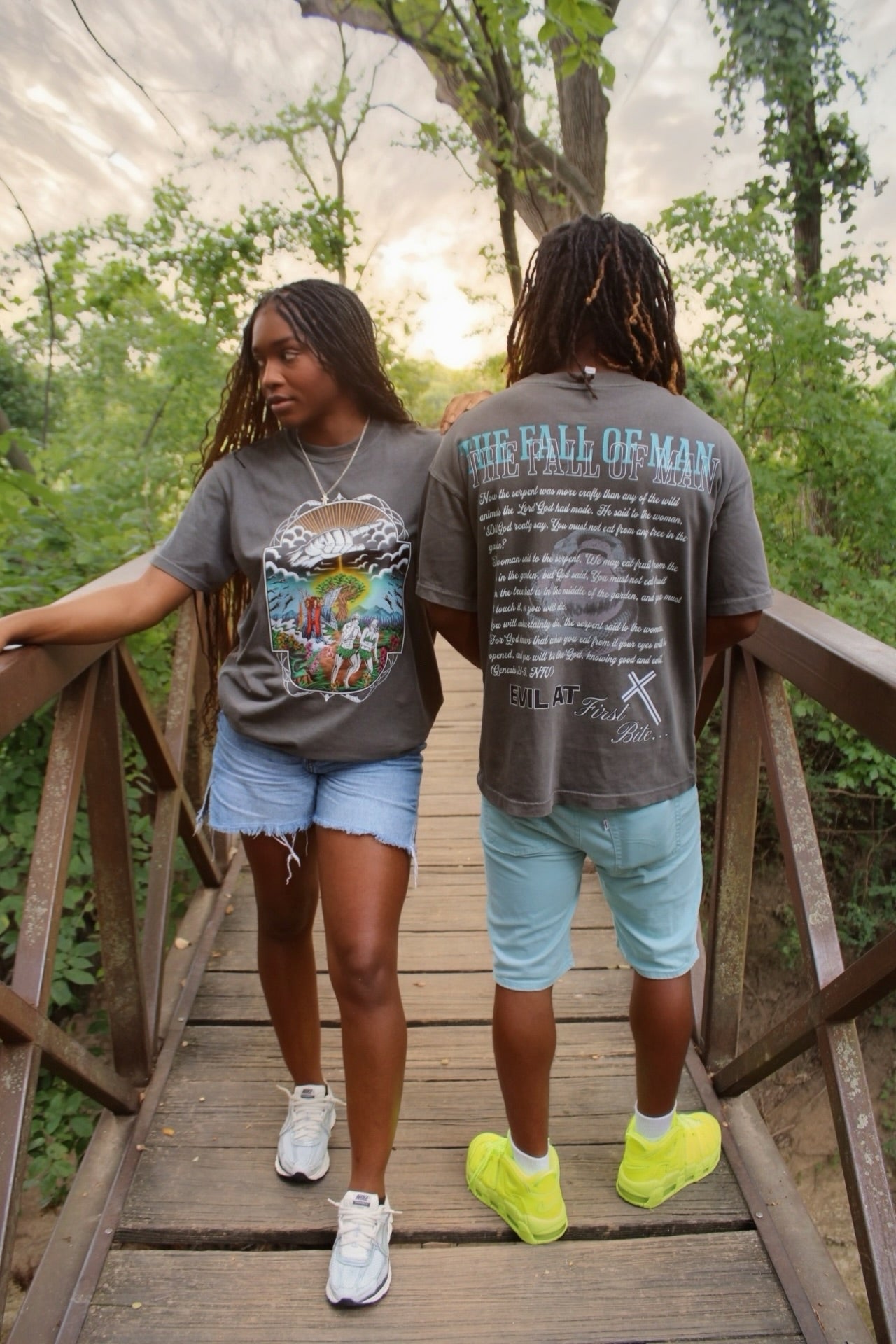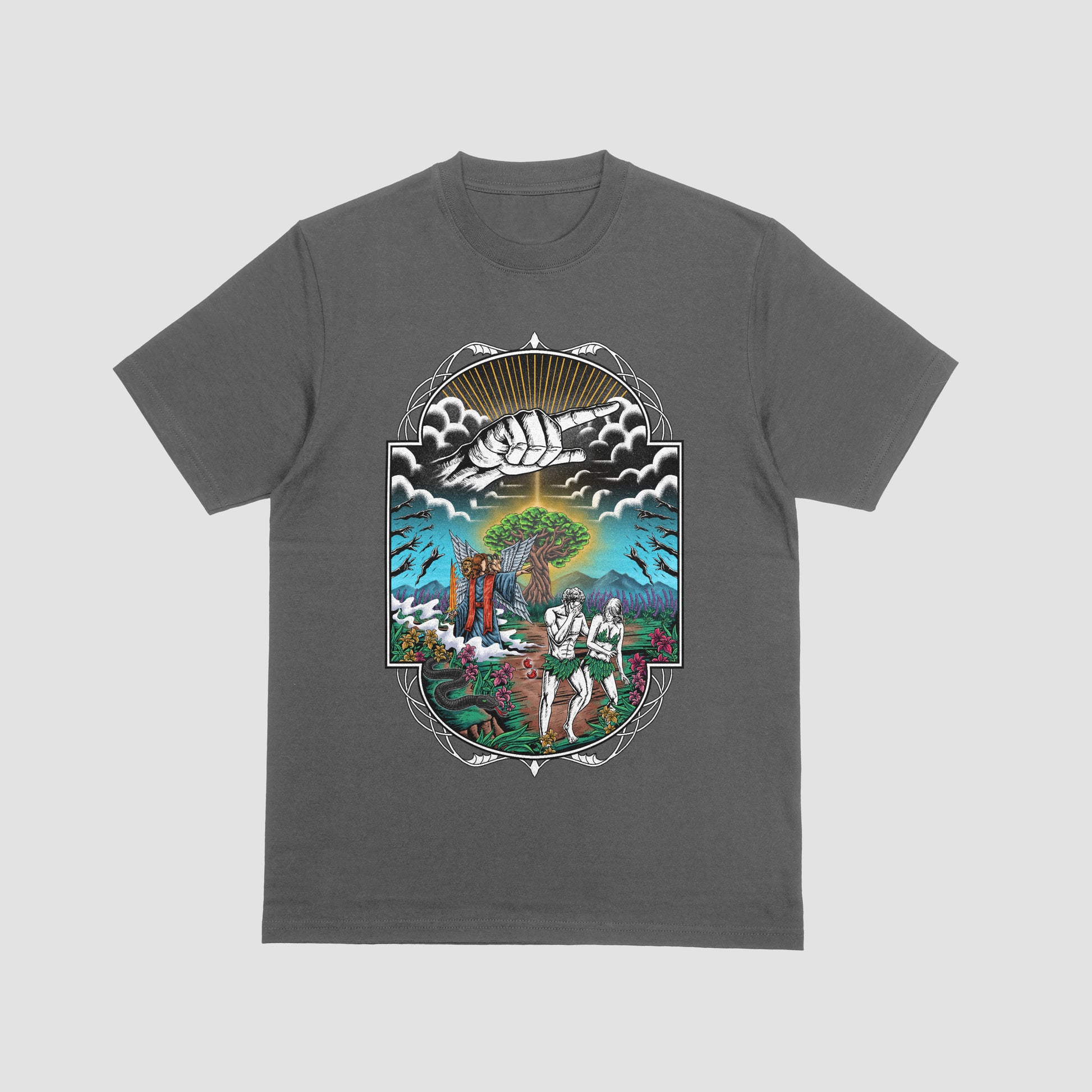 "This 100% heavyweight cotton tee captures one of the rawest moments in Genesis — the exile of Adam and Eve from Eden. Featuring bold, front-and-back graphics that blend biblical symbolism with modern edge, the design tells a story of rebellion, loss, and the start of the human journey. Washed for a premium feel and cut with street-ready structure, this piece turns ancient narrative into visual statement. Limited drop. No returns to Eden."